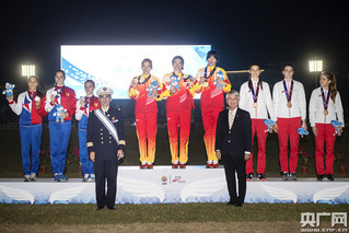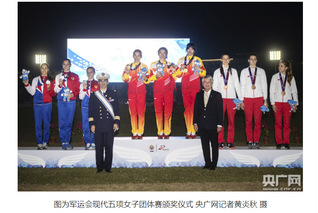 现代五项混合接力颁奖仪式结束之后中国队的所有队员都聚到...