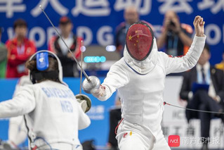 佩戴五星红旗图案头盔面罩的中国选手在击剑比赛中。上午9点3...