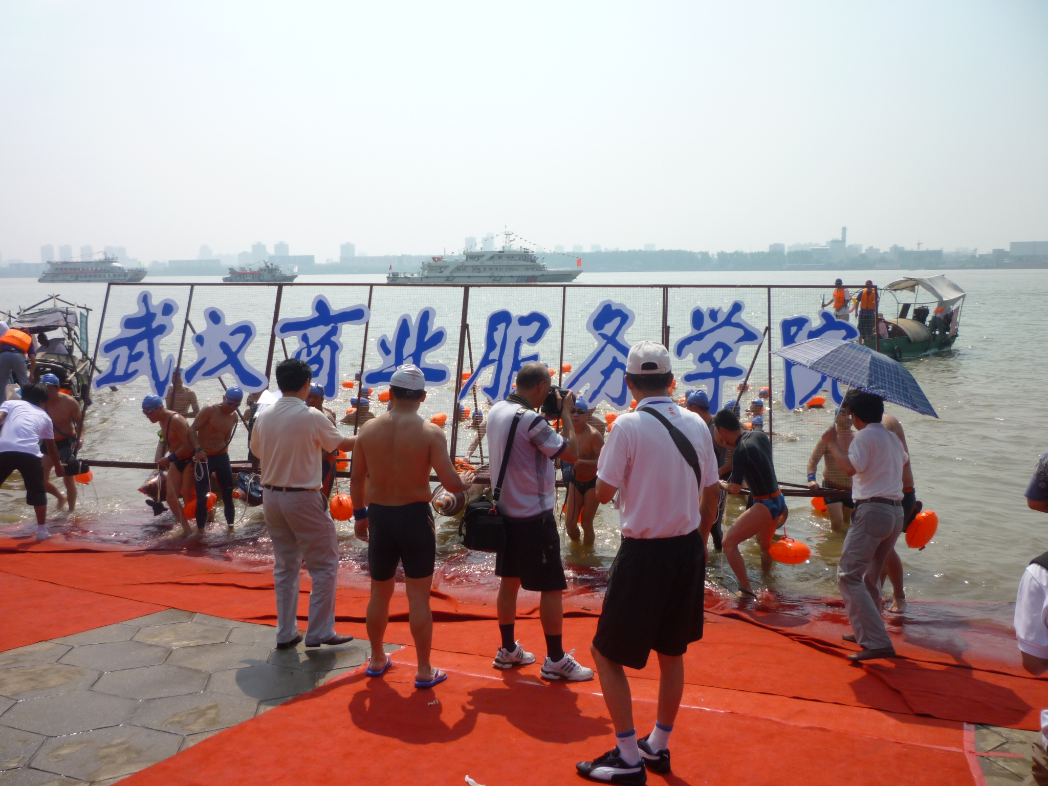 1956年,武汉市举行首届横渡长江活动,到今年已经是第36届,今年特地选择了43年前毛泽东在汉畅游长江的日子,举行此次渡江活动。共有红旗方队、黄鹤楼科技园方队及我校等12支方队,来自我省、外省及外国的游泳爱好者716名参加了横渡长江活动。渡江从武昌汉阳门码头到三峡石广场,全程共计4300米。8点45分各方队陆续下水,横渡方队下水结束后,还有近千名游泳爱好者组成的各区代表方队,从汉阳江滩大禹神话园开始漂流。