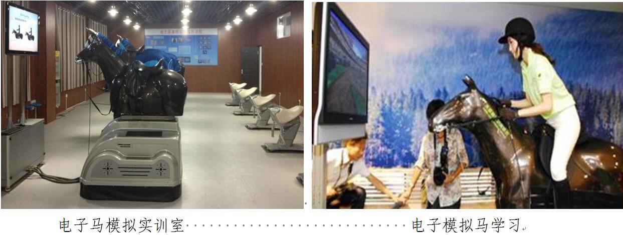 电子马模拟实训室建筑面积约145平米,设备价值约1,207,400元,教学仪器设备有简易电子马、电子屏幕模拟马等,主要用于骑术训练理论与实践、马术骑乘技术分析等课程的教学与实践,主要实训项目有基本骑乘技术学习等。